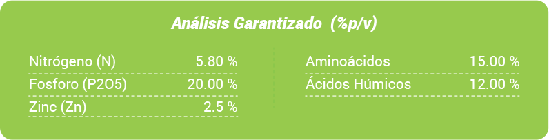 Ayuda a los cultivos a vigorizar su crecimiento y desarrollo. Potencializa la asimilación de los fertilizantes aplicados, mejorando la nzosfera y actuando sobre los procesos metabólicos de la planta. Su efecto ayuda superar condiciones de estrés, su aplicación es vía fertiriego, también en caso puede aplicarse vía foliar.